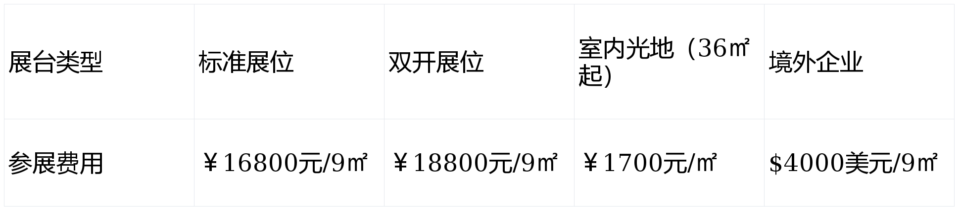 注1:尺度展位根基设置装备摆设:(长3米x宽3米x高2。5米)、三面围板(白色)、公司中英文楣板、一个电源插座(500W以内)、两支日光灯、一张征询台、两张折椅、地毯、垃圾篓等。